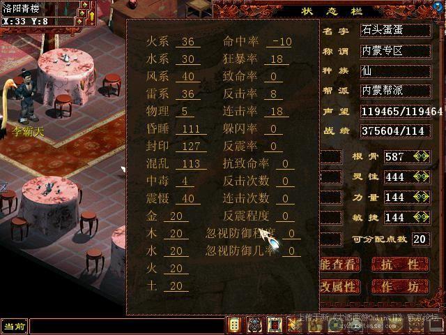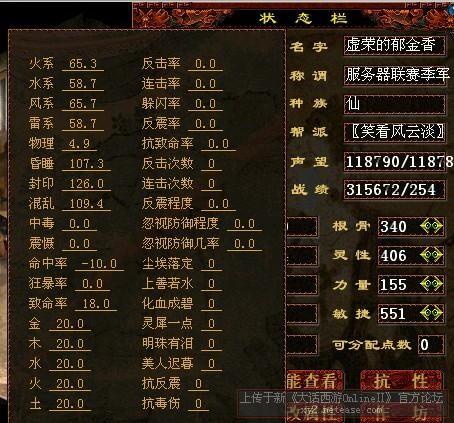 血法敏仙或者纯血法仙:血法敏,就是指在能搭配14级新装备400灵性的的要求下,加到400左右的敏捷,其余加血量!随着等级提升,杀伤力和血量的不断增加来保证其抗击打能力!纯血法仙,曾几何时,以石头蛋蛋为代表的不死之身风靡大话仙族!这样的仙就是放弃敏捷,加够400灵性,其他全血,血量在10万以上,由于搭配布定鞋子,可以同时做到高抗仙法的同时还抗吸!(下面这张图为石头蛋蛋5联时候的抗性)在初期,被认为是不死之身!但是由于现在的杀伤力多样化,内丹效果的多元化,每人再敢称不死之身了!等级提升,意味着血量将再次提升,抗击打能力再上一个台阶,杀伤力更加恐怖,只要五行相克相信秒杀12万以上不再是神话!