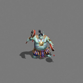 手握两柄摇鼓,挺着啤酒肚子,蓝色的皮肤彰显着自己的异族血统。晃动着硕大的身体,似乎在呐喊着:“谁来与我大战三百回合?”