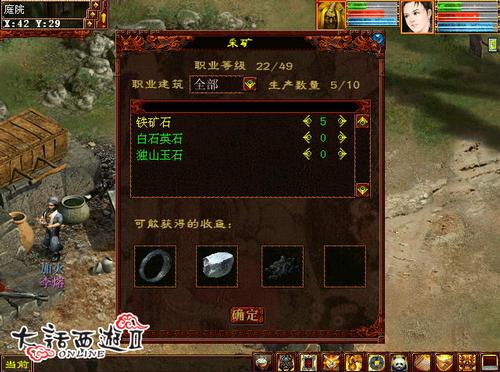 当进度条读取完毕之后,你就得到了该矿石。不同职业建筑等级的玩家,每天可采的矿石数目是有限制的。采集完矿石之后,回到自家矿场,找到钟离秋,开始冶炼。选择冶炼矿石,把需要冶炼的矿石放进去,开始冶炼。