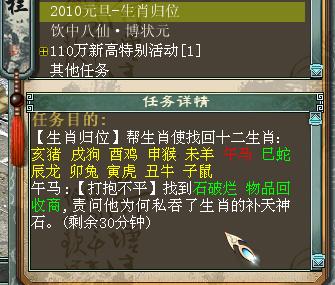 2.玩家领取生肖任务后,会在任务栏有提示。其中未完成任务的生肖颜色为黄色,已完成任务的生肖颜色为绿色,正在进行或者任务超时没有完成的生肖颜色为红色。