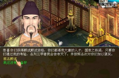 殿试现在改为同步答题的模式,即参加殿试的考生会在同一时间开始答题。通过省试获得殿试资格的考生需要在19:45-20:00期间到皇宫找唐王李世民选择参加殿试,随后考生会被传送到皇宫考场中。20:00整殿试准时开启,只有在考场中才能够进行殿试答题。殿试开始后将不能再次进入考场,所以请玩家不要轻易离开考场。