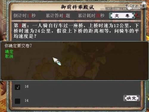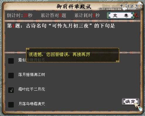 20:00殿试准时开始,这时报名成功的玩家游戏窗口中会弹出一个答题框。玩家选出正确答案并点击确认后系统会记录玩家回答该题的时间。