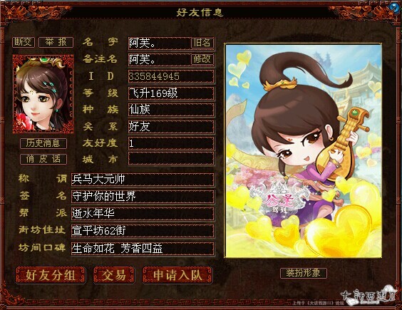 阿芙。:我很感谢她 以前我玩大话都是单机游戏 总是一个人玩 好友没有几个 而来这个帮才开始接触不少朋友
