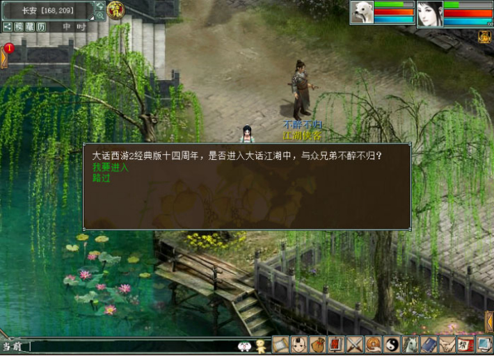1、活动开启后可以到长安城(172,214)处找江湖侠士进入大话江湖中与众好友一起对酒当歌(获取经验)。