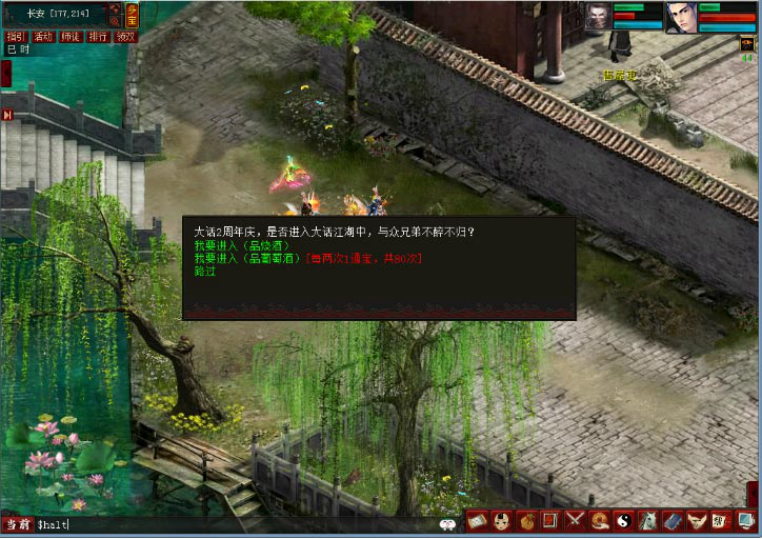 1、活动开启后可以到长安城(172,214)处找江湖侠士进入大话江湖中与众好友一起对酒当歌(获取经验)。